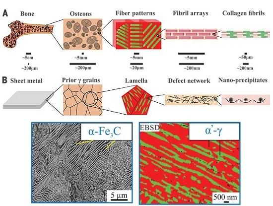 Motomichi Koyama e seus colegas da Universidade Kyushu, no Japão, foram buscar inspiração nos ossos, que também são submetidos a essa ciclagem constante, mas possuem uma resistência superior à do aço devido à sua subestrutura hierárquica e laminada.