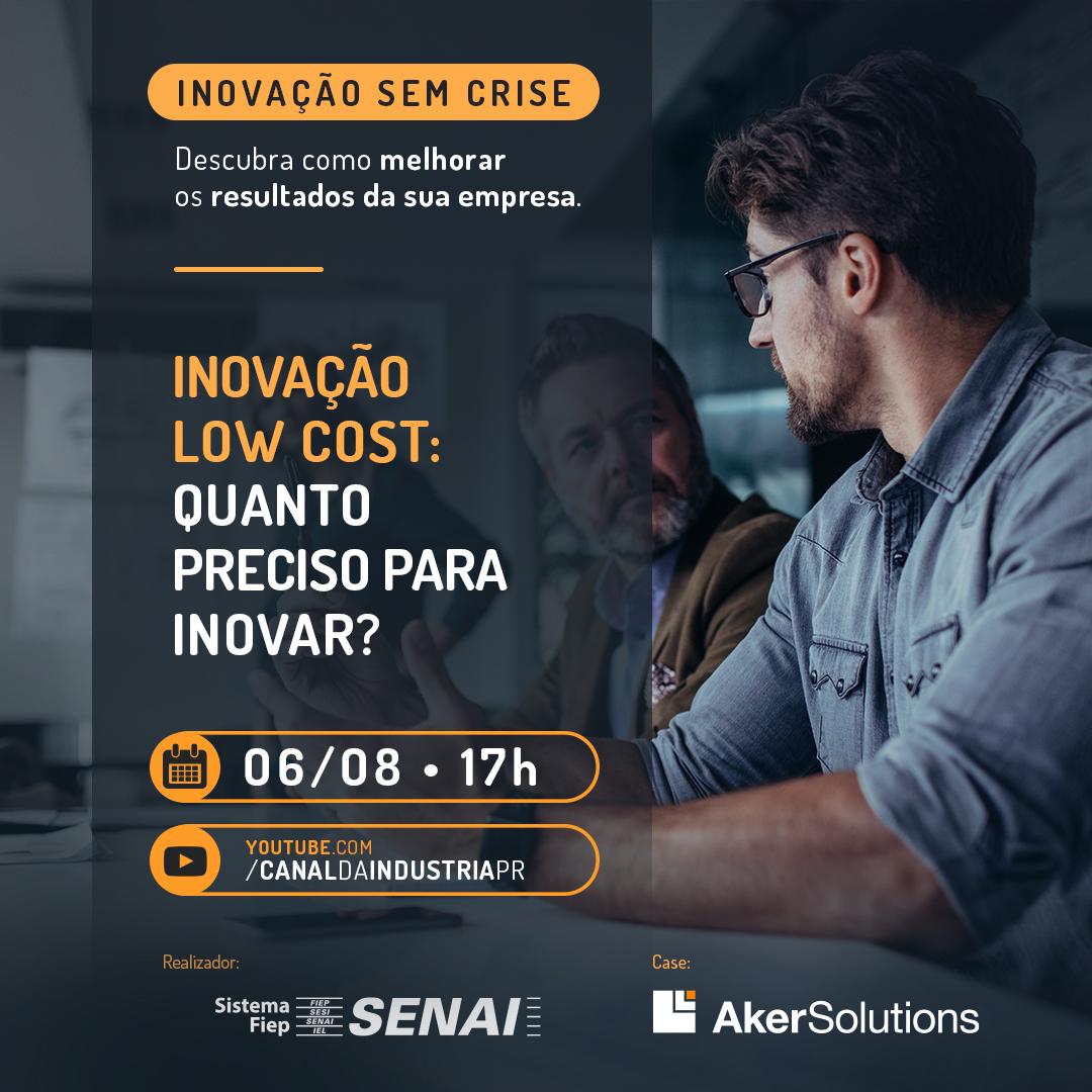 A live vai ao ar às 17h e contará também com a participação de Paulo Chiquito (líder de Tecnologia e Inovação na Aker Solutions) e Sabrina Levinton (consultora em Gestão da Inovação no Sistema Fiep). A ação é voltada a todos os empresários que tenham interesse em promover a inovação a baixo custo em seus negócios ou mesmo profissionais que estejam ingressando no mercado de trabalho ou começando a empreender. As inscrições são gratuitas e podem ser feitas pelo site do Senai.