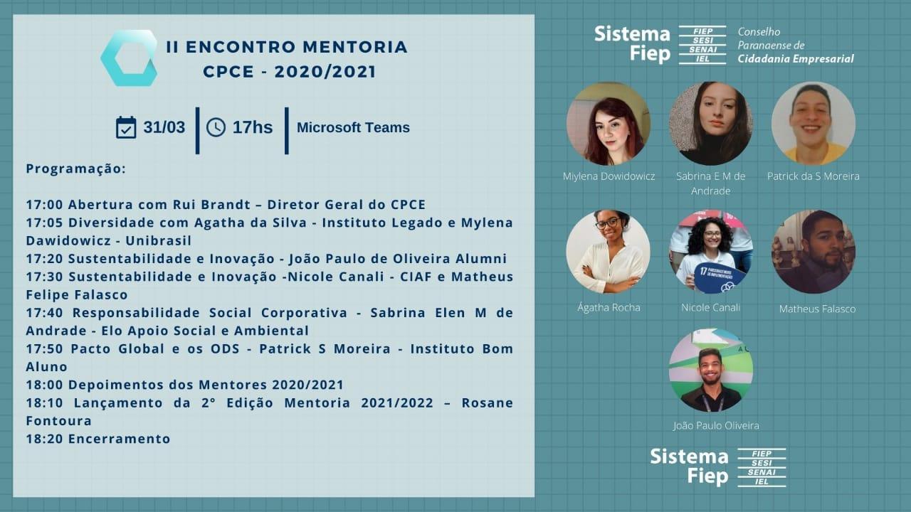 Neste mesmo encontro a coordenadora do CPCE, Rosane Fontoura fez o pré-lançamento e da segunda edição do Programa de Mentoria que se realiza em 2021,  para o qual foram apresentados os conselheiros seniores convidados a serem mentores: Cristina Gonçalves, Carlos Magno, Erycleia Freire, Luciano Planca, Pedro Salanek e Rafael Bonfim, tendo estes a oportunidade de compartilhar vivências e conhecimento acerca de suas trajetórias profissionais e desenvolvimento pessoal. Também foram apresentados e os conselheiros juniores que serão mentorados e que representam instituições conselheiras, sendo elas: Associação São Roque, FAE, Instituto Compartilhar, Renault, Hospital Pequeno Príncipe, Passos da Criança, UNILHEU, Organização de Desenvolvimento do Potencial Humano – ODPH e UFPR.