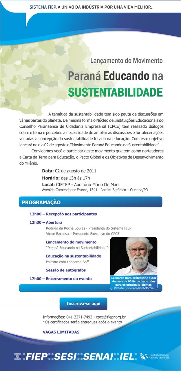 O movimento terá como norteadores a Carta da Terra para Educação, o Pacto Global e os Objetivos de Desenvolvimento do Milênio. O evento contará com a presença do Presidente do Sistema FIEP, Rodrigo da Rocha Loures, do Presidente Executivo da CPCE, Victor Barbosa e será realizada uma palestra sobre educação na sustentabilidade ministrada pelo professor e escritor Leonardo Boff, no auditório Mário De Mari, a partir das às 13 horas.