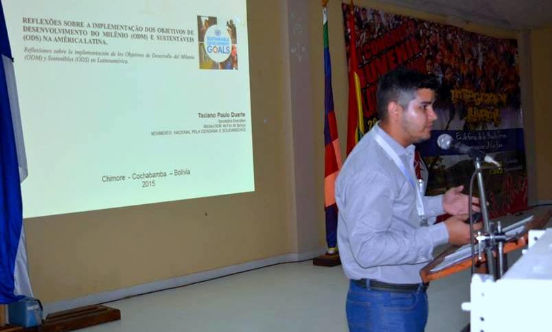 O secretário executivo do Núcleo ODM de Foz do Iguaçu, Taciano Paulo Duarte, ministrou a conferência intitulada “Reflexiones sobre la Implementación de los Objetivos de Desarrollo del Milenio (ODM) y Sostenibles (ODS) em Latinoamérica” durante o II Congresso de Integração Juvenil Latino-americano que aconteceu entre os dias 29, 30 e 31 de outubro no campus da Universidade Indígena Boliviana Quechua Casimiro Huanca (UNIBOL) no município de Chimoré, Cochabamba – Bolívia.
