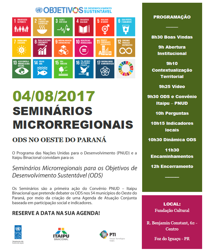 No mês de agosto acontece no Oeste do PR um ciclo de Seminários sobre Os Objetivos de Desenvolvimento Sustentável e a Agenda 2030 na região. A iniciativa visa apresentar a proposta do projeto de Cooperação Técnica entre a Itaipu Binacional e o Programa das Nações Unidas para o Desenvolvimento (PNUD), com o apoio da Fundação Parque Tecnológico Itaipu (FPTI), contribuindo para a estratégia de Localização dos ODS nos municípios e a construção de Indicadores de Monitoramento para as metas propostas pelos ODS.