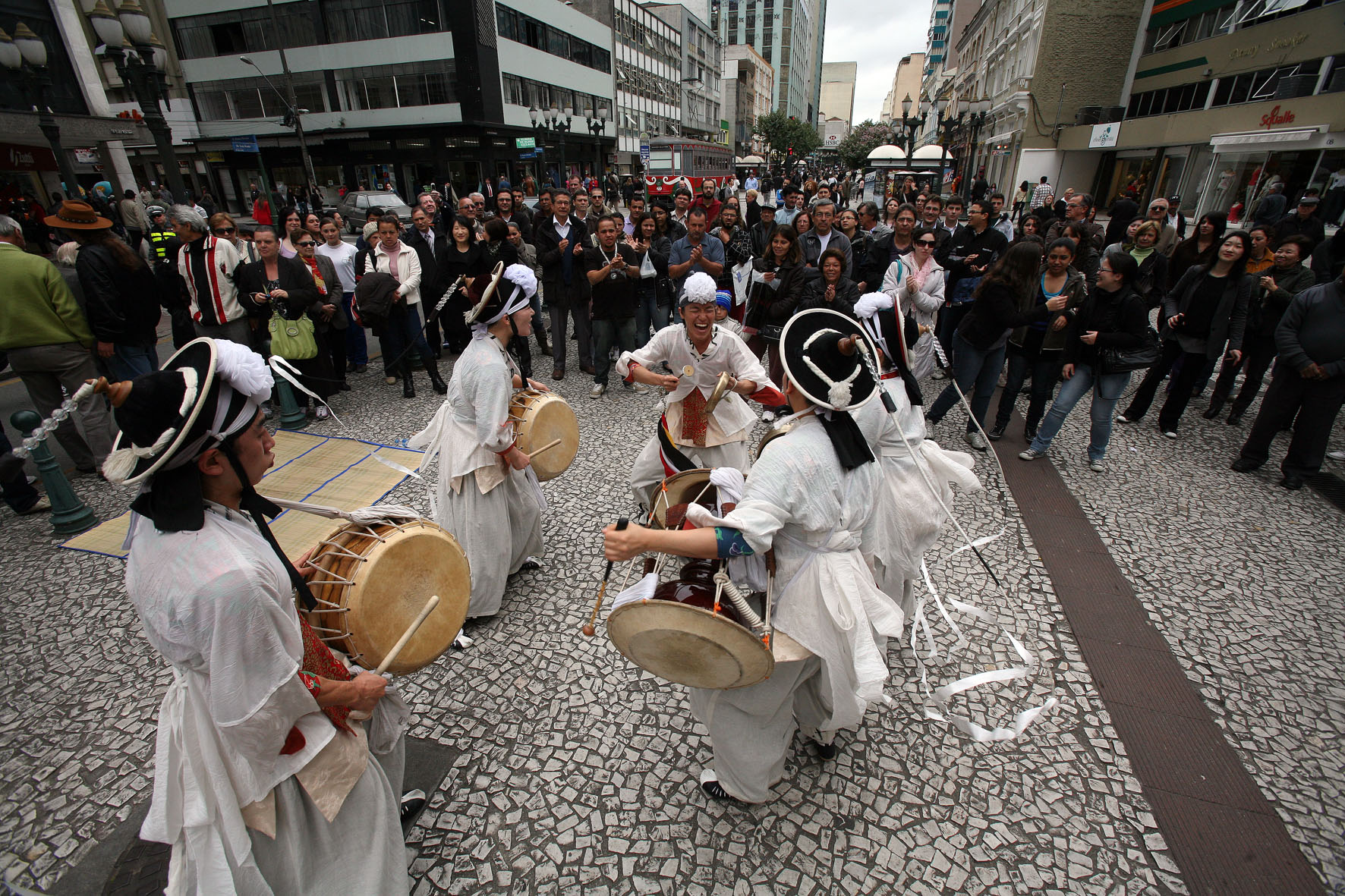 O grupo internacional Dulsori surpreendeu os curitibanos com a apresentação da música e arte coreana, na última sexta-feira (16), na Boca Maldita. Com instrumentos musicais e trajes típicos, o grupo disseminou alegria, entusiasmo e amor pela vida, mensagens construídas por meio do som que contagiou quem passava pelo local. A vinda do Dulsori para Curitiba conta com o apoio do Sesi e da Fiep. O grupo também se apresentou no sábado (17), no Teatro Guairinha. Alguns minutos foram suficientes para que dezenas de pessoas se reunissem em torno do Dulsori, participando ativamente da apresentação, com muitas palmas e interação. Rosa Cristina Amálio parou para conferir o momento e destacou a alegria do grupo. "É a primeira vez que vejo uma apresentação tão diferente. A dança, as vestimentas e a simpatia dos integrantes são contagiantes", destacou. Leia mais.