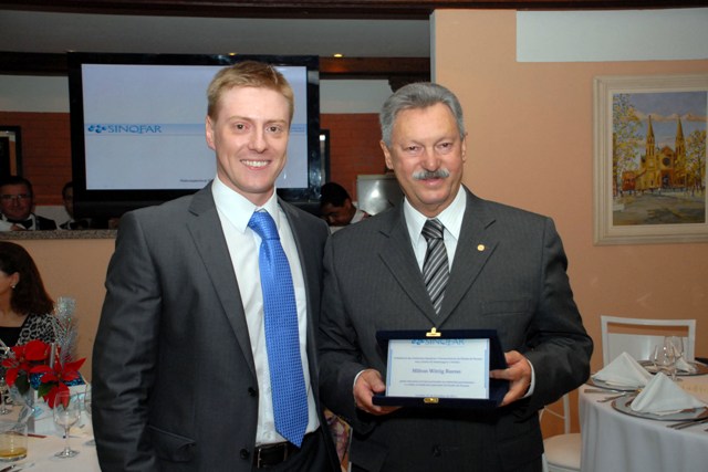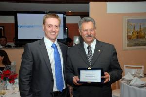 clique para ampliar clique para ampliarReconhecimento: O presidente do Sinqfar, Marcelo Melek entrega a placa de homenagem ao gerente de relações com os sindicatos, Milton Bueno (Foto: Mauro Frasson)