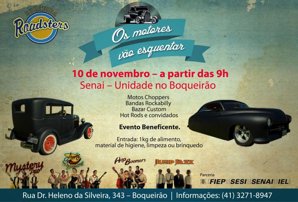 No próximo sábado, dia 10 de novembro, acontece no Senai do bairro Boqueirão (Rua Doutor Heleno da Silveira, 343), à partir das 9 horas, show beneficente, com  exposição de mais de 30 carros antigos e motos choppers e participação de quatro bandas de rock. Para participar é preciso doar um quilo de alimento não perecível, material de higiene e limpeza ou um brinquedo. O objetivo do evento é abrir as portas da unidade do Senai para a comunidade. O evento é uma realização do Sistema Fiep em parceria com o Clube Roadsters, de Curitiba.