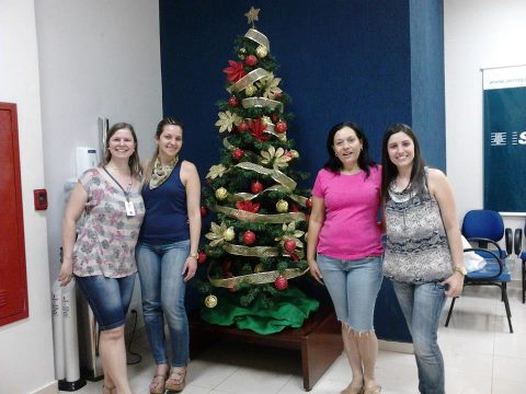 clique para ampliar clique para ampliarColaboradoras do Senai em Maringá, Regiane Paio, Fernanda Calaresi, Mara Lúcia Zaperllon e Helen Camila, que auxiliaram na decoração natalina da unidade. (Foto: Divulgação)
