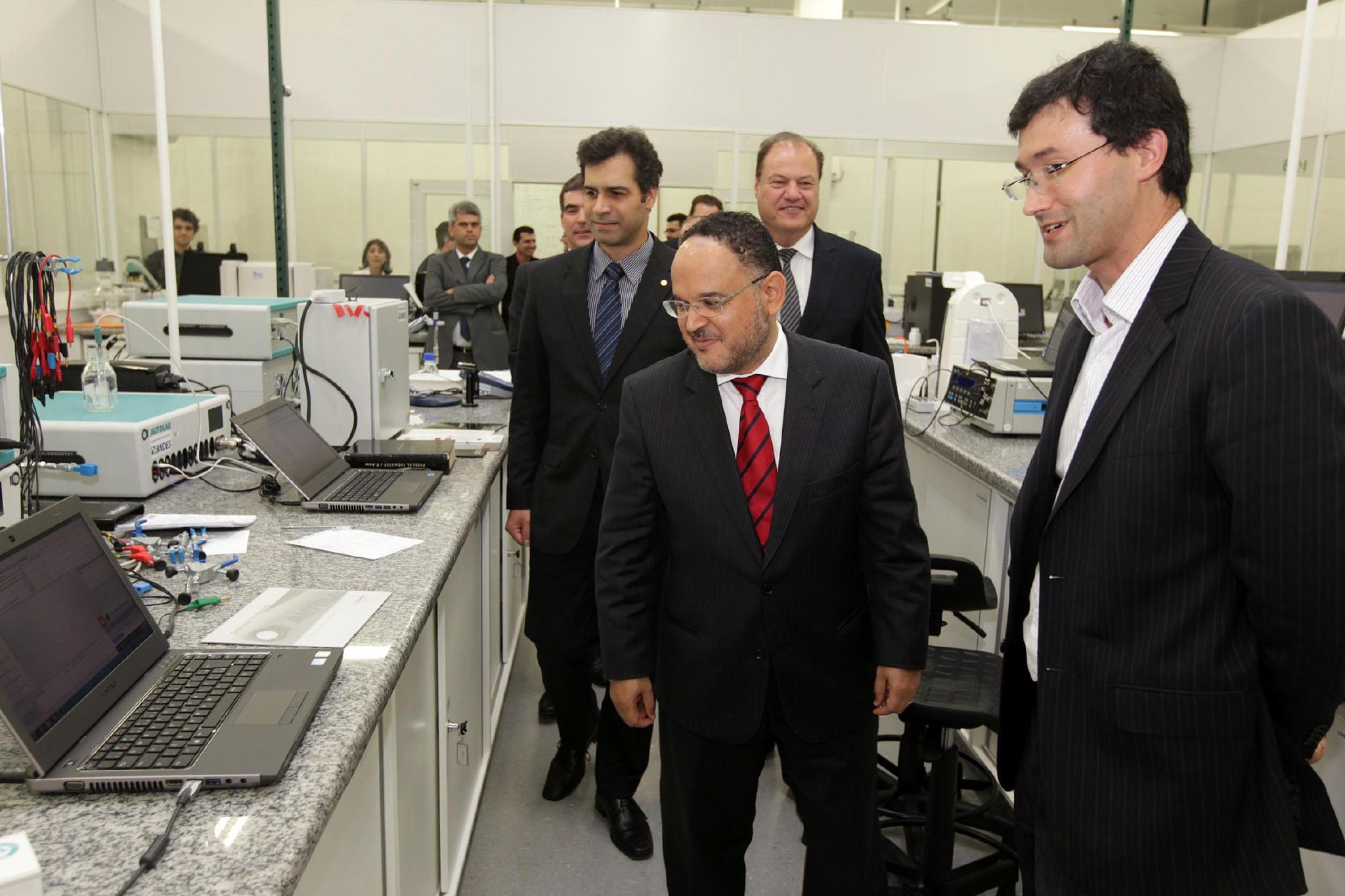 clique para ampliar>clique para ampliarHenrique Paim (de gravata vermelha) visitou os laboratórios do ISI em Eletroquímica (Foto: Mauro Frasson)