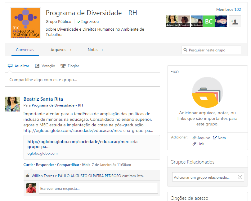 clique para ampliarclique para ampliarNo Yammer, também é possível criar grupos de trabalho para discutir temas em comum. No exemplo, o grupo do Programa de Diversidade, do RH