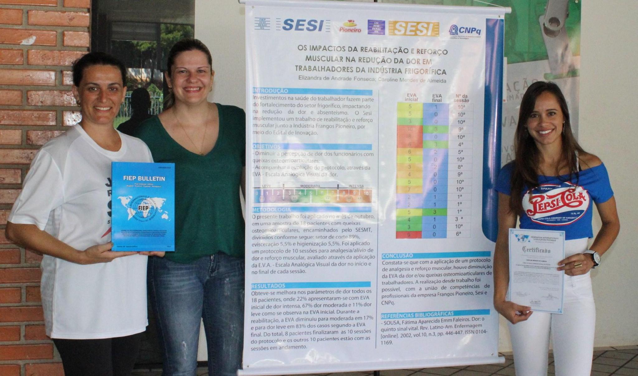 Na ocasião elas apresentaram o trabalho científico “Os impactos da reabilitação e reforço muscular na redução da dor em trabalhadores da indústria frigorífica”. O trabalho é um dos resultados conquistados pelo projeto de inovação Céu do Corpo, realizado pelo Sesi, unidade em Santo Antônio da Platina e Departamento Regional do Paraná, em parceria com o Sesi Nacional, Frangos Pioneiro e CNPq (Conselho Nacional de Desenvolvimento Científico e Tecnológico).