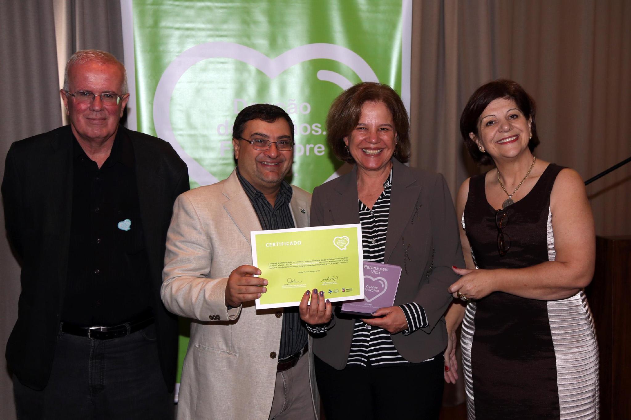 O Sesi Paraná recebeu, no dia 1º de outubro, o Selo Paraná Pela Vida 2015, concedido pela Central Estadual de Transplantes (CET-PR) aos apoiadores da divulgação da causa no Estado. A ação faz parte da campanha Fale Sobre Isso, do Governo do Paraná, que incentiva as pessoas a comunicarem a família sobre o desejo de se tornar um doador de órgãos. O certificado e a placa de homenagem foram recebidos pela gerente de projetos de articulação estratégica e inovação social do Sesi, Maria Cristhina Rocha.