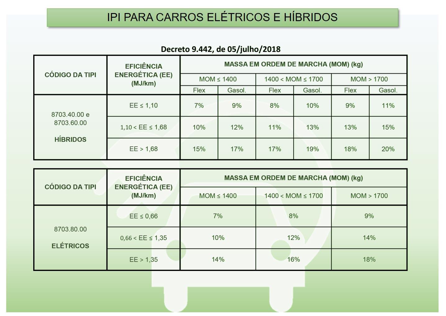 No caso dos elétricos, as tarifas são menores, mas também acompanham as mesmas três faixas do peso do automóvel. Os veículos com eficiência energética de até 0,66 MJ/km recolhem 7%, 8% e 9% de IPI. O tributo sobe para 10%, 12% e 14% quando a eficiência fica entre 0,67 MJ/km e 1,35 MJ/km. Os elétricos menos eficientes, com consumo energético superior a 1,35 MJ/km, recolhem de 14%, 16% e 18% de IPI.
