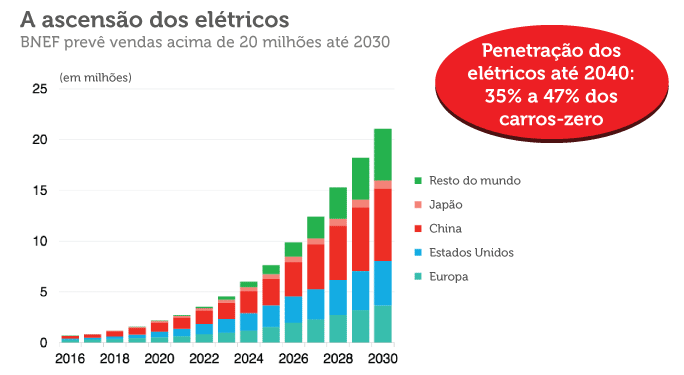 Trata-se da mais otimista projeção para os carros elétricos já feita por um representante de alguma gigante do setor de petróleo, superando as previsões da própria BNEF, segundo Colin McKerracher, analista-chefe de transportes avançados da entidade.