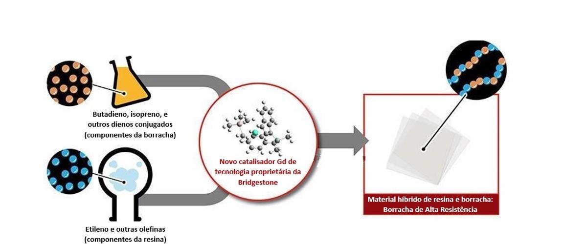 a borracha e resinas em nível molecular. Segundo a empresa, o material resultante é capaz de combinar a maleabilidade da borracha