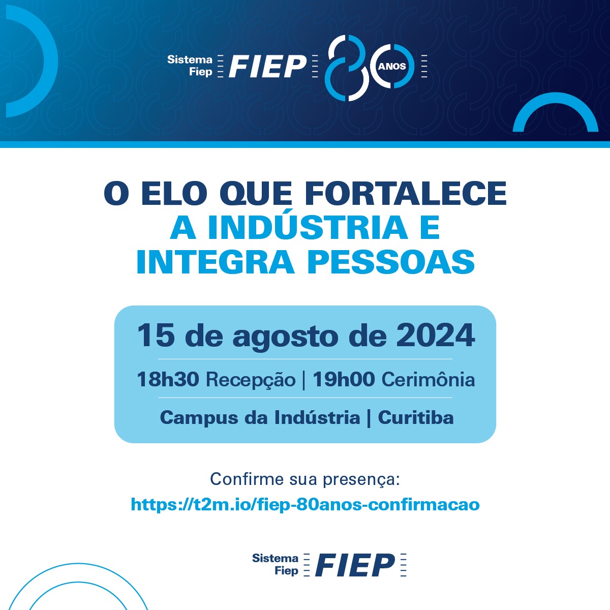 CONVITE: 80 anos Fiep | 15 de agosto - Confirme sua participação no link: https://t2m.io/fiep-80anos-confirmacao