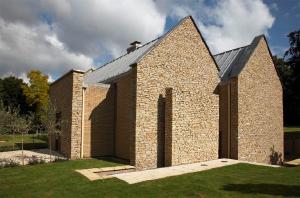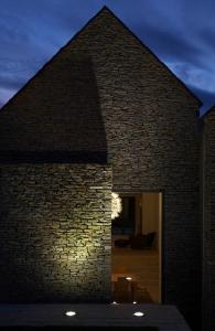 O projeto do escritório de arquitetura Baynes & Co foi aceito graças ao muro de pedras, que pode ser movido por um motor especialmente construído para a tarefa, com fundações reforçadas. Quando está na lateral, a parede permanece em pé apenas com uma guia quase imperceptível em sua parte superior. A rocha escolhida foi o calcário Cotswold, original da região, revestido com tijolos amarelados. O trabalho com as pedras foi realizado pela empresa Boden & Ward.
