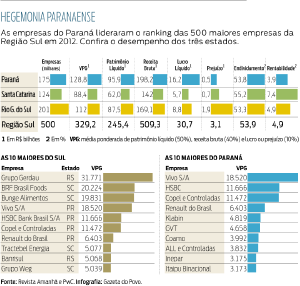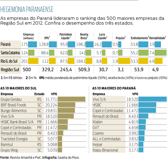 Apesar do cenário econômico desfavorável em 2012, as empresas paranaenses lideraram o ranking das 500 maiores da Região Sul, feito pela revista Amanhã e pela consultoria PwC, no ano passado. Foi o segundo ano em que as companhias do Paraná foram campeãs em patrimônio líquido, faturamento e lucro, os três quesitos que compõem o Valor Ponderado de Grandeza (VPG), principal critério para classificação das empresas no ranking. Somado, o VPG das empresas paranaenses ficou em R$ 128,8 bilhões – um avanço de 16% sobre o resultado de 2011.
