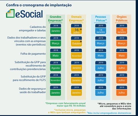 O cronograma para implantação do Sistema de Escrituração Digital das Obrigações Fiscais, Previdenciárias e Trabalhistas (eSocial) , estabelecido pela Resolução do Comitê Diretivo do eSocial (CDeS) nº 02/2016, foi reformulado por meio da Resolução CDeS nº 04/2018 publicada no DOU em 11 de julho de 2018. Dentre as alterações promovidas pela nova Resolução está a inclusão do tratamento diferenciado, simplificado e favorecido dispensado às Microempresas (ME) e Empresas de Pequeno Porte (EPP), ao Microempreendedor Individual (MEI) que contrata empregado, ao Segurado Especial e ao pequeno Produtor Rural Pessoa Física. Conforme o art. 4º desse dispositivo, esses empregadores/contribuintes poderão optar pelo envio dos eventos ao Ambiente Nacional do eSocial de forma cumulativa, ou seja, transmissão das fases 1 e 2 no mesmo prazo estabelecido para o envio da fase 3. Ressaltando que para pessoas físicas empregador doméstico, essas regras não são aplicáveis. Para empresas com faturamento inferior a R$78 milhões, o eSocial ampliou o prazo da primeira fase de implantação do programa para este grupo, que terminaria neste mês de agosto. Nesta etapa, as chamadas empresas do segundo grupo deverão realizar seus cadastros como empregadores no sistema e enviar tabelas ao eSocial. Com a mudança, a segunda fase, que se iniciaria em setembro, passou para o mês de outubro deste ano. A data prevista para o início da segunda fase é 10 de outubro. Nesta segunda etapa, os empregadores deverão informar ao eSocial dados dos trabalhadores e seus vínculos com as empresas, os chamados eventos não periódicos. As empresas que integram o primeiro grupo (com faturamento superior a R$ 78 milhões) deverão continuar enviando todos os eventos para o ambiente do eSocial. Como sua empresa está diante do eSocial?